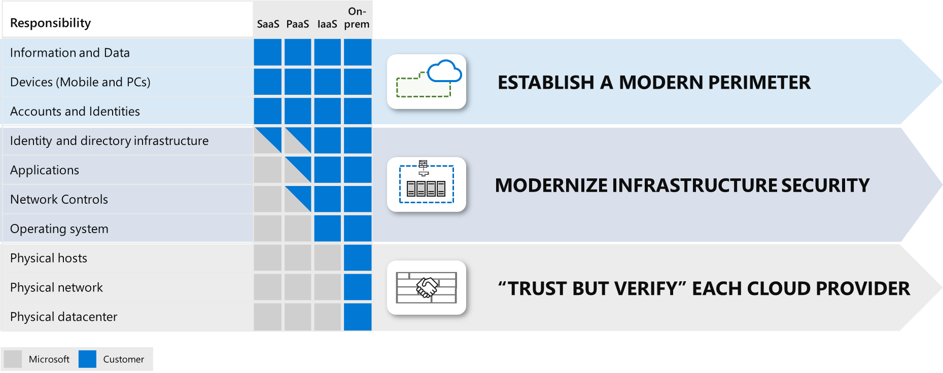Azure documentation shares three key strategies to address shared responsibility as shown in the picture above