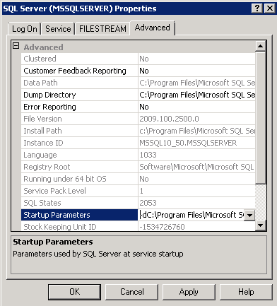 - Remove ‘-m’ from startup parameters, click ‘Ok’ to apply the changes and start SQLServer(MSSQLService) service