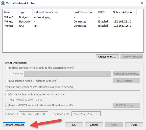 - Click ‘Restore Defaults’ as shown below. Restart your VMware workstation and it came up good.